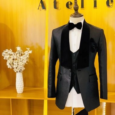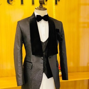 Rated 0 out of 5$400.00D E T A I L S THREE PIEDE TUXEDO VELVET BLACK LAPEL BLACK PLAIN IRISH PANTS JACQUARD JACKET & WAIST JACKET SLIM FIT 3WEEKS DURATION- BLACK N X -